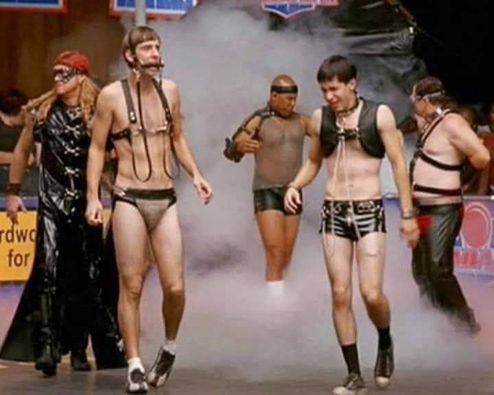 Et c’est ainsi que le public qui s’apprête à découvrir cette équipe jusque là inconnue des Average Joe’s, voit émerger du brouillard ce qui semble être une équipe à moitié nue et exhibant des tenues d’esclaves sexuels dont ils n’ont manifestement pas le physique.