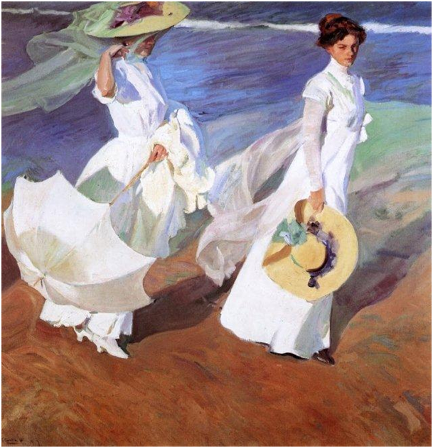 D’un point de vue chromatique, tandis que le vêtement de la première femme apparait d’un blanc immaculé à la lumière du soleil, le vêtement de la seconde femme , bien que blanc lui aussi, et apparemment identique à celui de la première, est en fait beaucoup moins lumineux. L’ombre de l’ombrelle, du bras, du chapeau, tachent le vêtement de bleu. La voilette, qui devrait être blanche, semble en fait vert d’eau à l’ombre du chapeau, et rappelle les nuances de la mer en arrière plan. Il est à noter que la voilette de la première, qu’elle a posé sur ses épaules, volette comme une traine derrière elle. Par un jeu de dégradés, le peintre l’a fait se fondre dans l’eau de la mer derrière elle, dans un ton bleu pâle qui rappelle justement l’ombre qui joue sur la seconde. Mon impression est que la seconde se noie : sa tête est baignée dans une nuance vert d’eau qui rappelle la mer derrière elle. Elle a la tête sous l’eau. D’ailleurs elle est gonflée comme si elle était pleine d’eau, à la manière d’une noyée. Je note également que les deux femmes portent des chaussures de couleurs différentes.